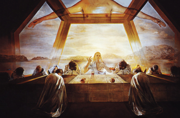 - And recently, Salvador DALI executed his painting, « The sacrament of the Last Supper », inside a golden rectangle. Then we can observe a massive dodecahedron (above the table). Since this polyhedron is made with 12 regular pentagons, it is directly associated with the golden ratio.