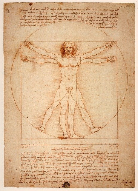- The Vitruvian man « (The man in action) » by Leonardo da Vinci: In this drawing appears three very distinct groups of golden rectangles: one for the head, one for the chest, and one for the legs.